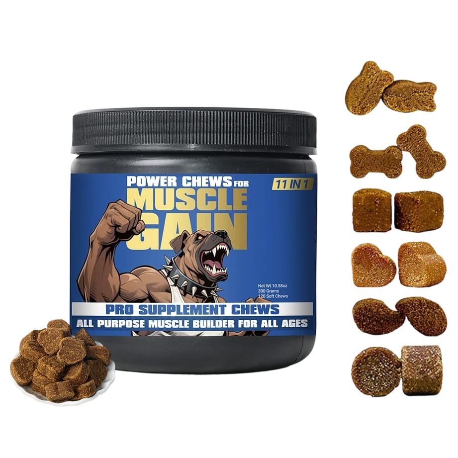 Power Chews: The 11-in-1 supplement with Creatine and Whey Protein for enhanced vitality, muscle development, energy, and agility. Unleash your dog's potential.